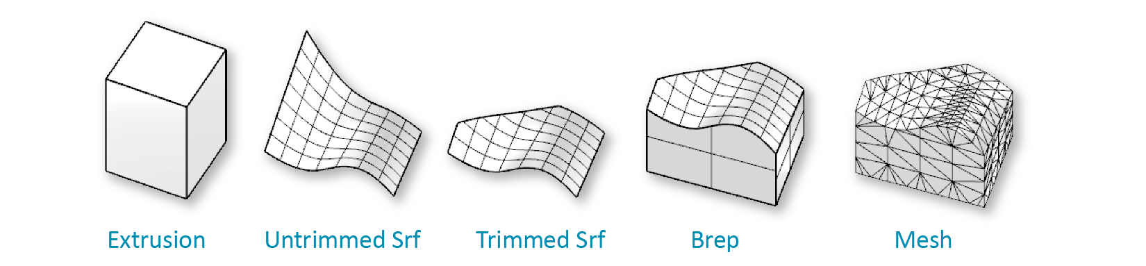 Daylight simulations involve the mathematical interaction of rays (representing light) and surfaces (representing physical objects). Before running a simulation, you must specify the physical elements of a scene using surfaces defined in Rhino or Grasshopper. These may include Extrusions, Surfaces, Meshes, and/or Boundary Representations (Breps).